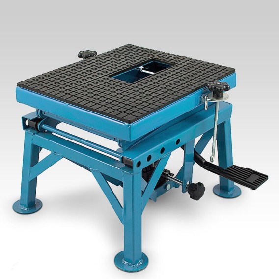 Podnośnik nożycowy warsztatowy dla motocykli i quadów. Idealny do serwisowania i napraw. Sprawdzi się w garażu jak i zarówno w profesjonalnym warsztacie. Podnośnik posiada 3 -stopniową regulację wysokości (60 cm, 75cm i 87 cm), pedał umożliwia zablokowanie na pożądanej wysokości. Platforma wyściełana jest gumą co zapewnia stabilną pozycję podnoszonego przedmiotu.