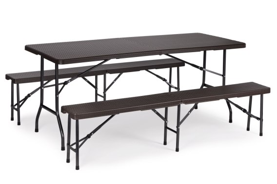 Komplet zapewni miejsce dla 8 osób, wysokości ławek i stołu zostały dobrane tak, aby zestaw gwarantował wygodę oraz komfortową pozycję podczas spotkań na świeżym powietrzu. Możliwość złożenia mebli w walizki pozwoli Ci zaoszczędzić miejsce podczas ich przechowywania, a także ułatwi transport.