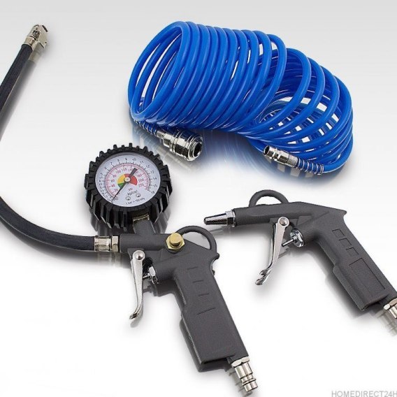 Zestaw akcesoriów do sprężarki składający się z 3 podstawowych akcesoriów, zestaw ten pozwoli napompować koła z kontrolą ciśnienia, użyć sprężonego powietrza do np. przedmuchiwania.