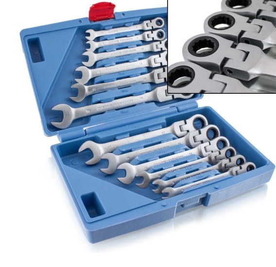 Zestaw 12 kluczy płasko oczkowych z przegubem. Narzędzia wykonane są z twardej stali chromowo - vanadowej odpornej na uszkodzenia.