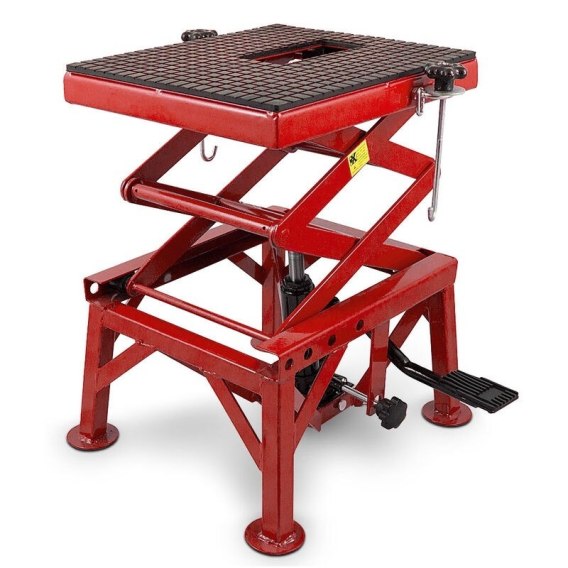 Podnośnik nożycowy warsztatowy dla motocykli i quadów. Idealny do serwisowania i napraw. Sprawdzi się w garażu jak i zarówno w profesjonalnym warsztacie. Podnośnik posiada 3 -stopniową regulację wysokości (60 cm, 75cm i 87 cm), pedał umożliwia zablokowanie na pożądanej wysokości. Platforma wyściełana jest gumą co zapewnia stabilną pozycję podnoszonego przedmiotu.