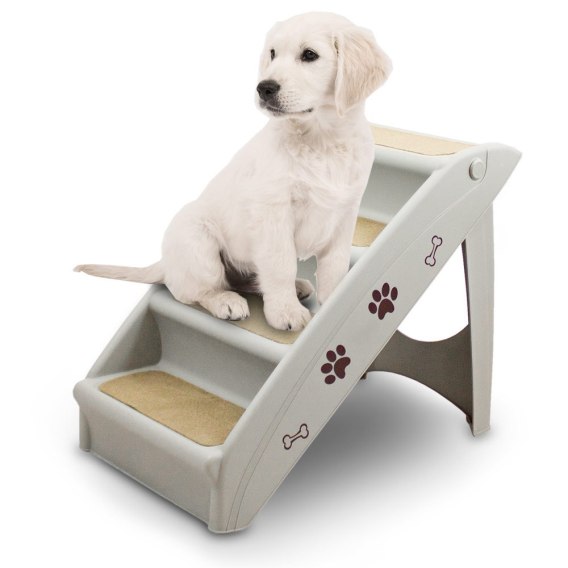 Można go złożyć, aby zaoszczędzić miejsce i np. schować w samochodzie. Dzięki maksymalnej nośności schody są również bardzo solidne, a jednocześnie bardzo lekkie. Stopnie są pokryte antypoślizgowym filcem, dzięki czemu zapewniają dobre wsparcie.