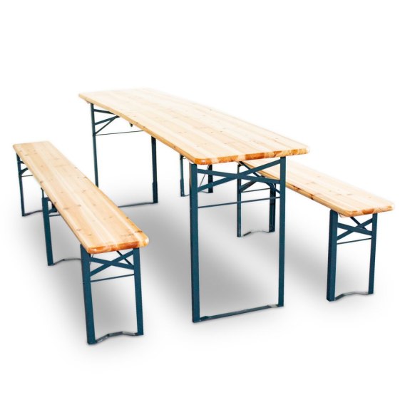 Zestaw namiotu piwnego składa się z dwóch ławek piwnych oraz stołu piwnego o długości 220 cm. Można go łączyć z innymi zestawami i meblami ogrodowymi i doskonale nadaje się na uroczystości takie jak urodziny, Oktoberfest czy imprezy firmowe. Ramy wykonane z wytrzymałej stali można złożyć w kilku prostych krokach, dzięki czemu ławki i stoły można ustawiać jeden na drugim i transportować, oszczędzając miejsce. Siedziska i blat stołu wykonane są z solidnego, solidnego drewna.